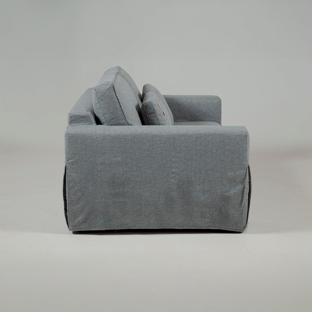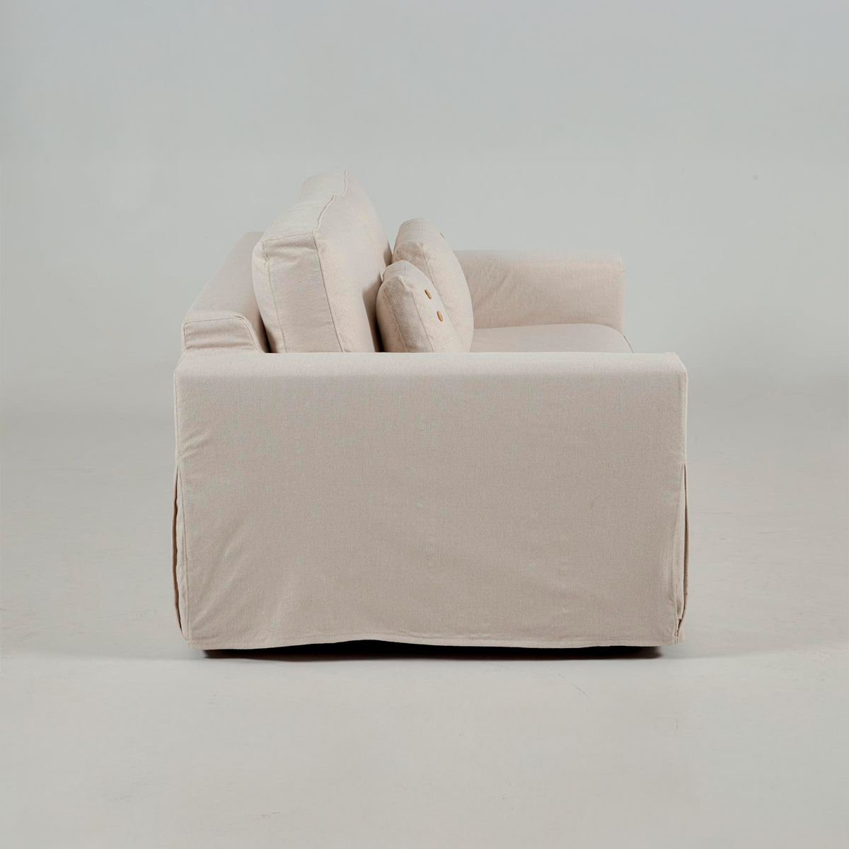 Ein Sofa, das Komfort und Zeitlosigkeit verströmt! Schon seine schlichte Anwesenheit im Wohnzimmer sorgt für ein Gefühl der Gemütlichkeit. Außerdem ist sein größter Vorteil seine Praktikabilität! Das Sofa ist vollständig von einem Bezug bedeckt, der bei Bedarf leicht abgenommen und gewaschen werden kann. Die Zugabe von zwei kleineren Kissen bringt noch mehr Komfort und einen Charme in der Ästhetik.